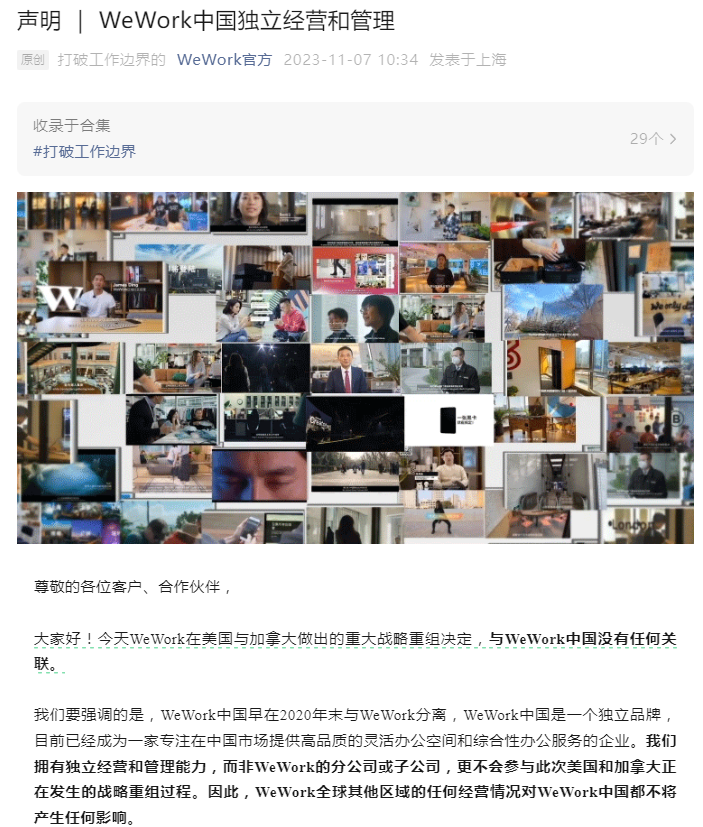 11月7日,WeWork中国官微发布声明称,今天WeWork在美国与加拿大做出的重大战略重组决定,与WeWork中国没有任何关联。