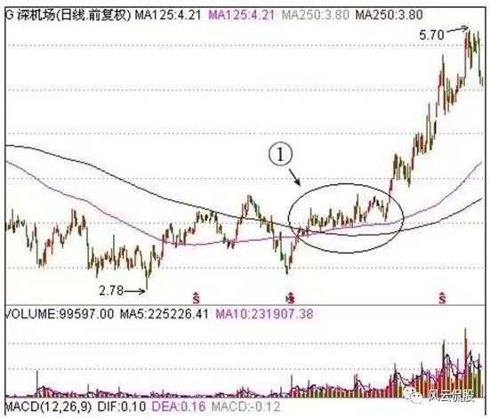 2、如下图中①处,该股稳稳地站上了半年线和年线,从此该股开始走牛!利用“牛熊分界线”选股,同时结合其基本面去挑选,这样准确程度就高了!如下图: