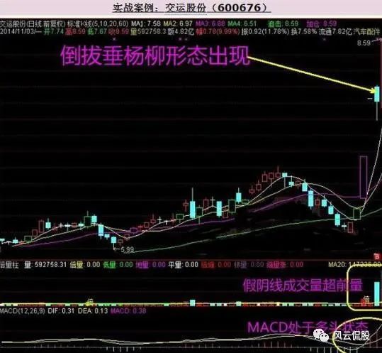 “倒垂杨柳”,是水浒传中形容鲁智深力大无比的一个词汇。基本意思是主力高开向下打,巨量吸筹,强庄才能这么做。至于实战中运用,不太好把握,因为很多主力出货也这么走,真真假假,总之要结合个股的整体走势综合判断。