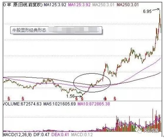 1、我们这里利用“牛熊分界线”,其实就是利用个股从低位向上突破半年线或者年线这个个股走牛的转折点,去选股和买股。股价K线有效站上半年线或者掉线,个股就有可能走牛了。如下图: