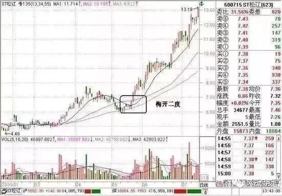 13日均线向上穿越55日均线以后,股价滞涨回落,13日均线弱势下叉34日均线,随着股价的止跌企稳,13日均线开始勾头向上二次穿越34日均线,我们把在主均线上的13日均线金叉穿越34日均线,称之为“梅开二度”。