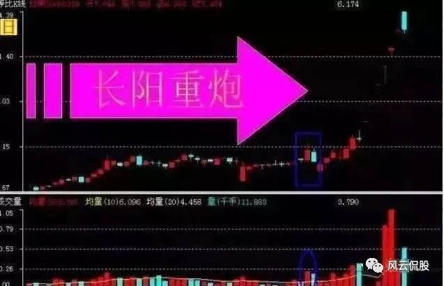 长阳重炮在低位温和放量后出现一根带量长阳,同时成交量jj为上叉阳量托,马上直扑追涨。