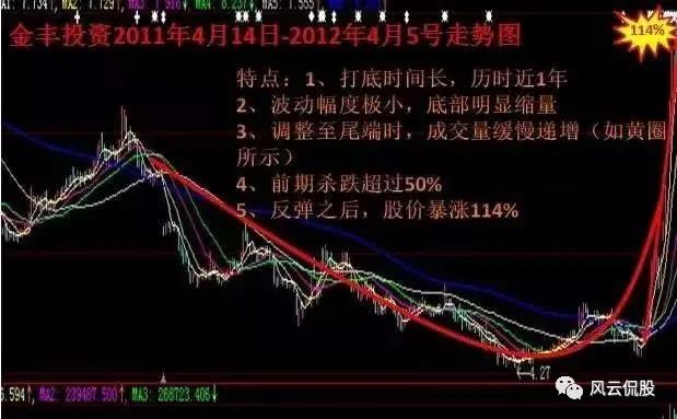 打底时间较长,股价日k线与平均线叠合的很近,盘至尾端时,成交量缓慢递增,之后就是巨量向上突破阻力线,在经历过大幅杀跌之后形成。