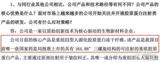 虽然医美行业已有不少入局者,但杨霞称“我们公司的产品它是到目前为止是全球独有二的一个产品”。其招股书中也介绍道,公司“重组Ⅲ型人源化胶原蛋白冻干纤维”具有较强的独特性和创新性,市场上暂不存在功效、特点方面完全可比的产品。