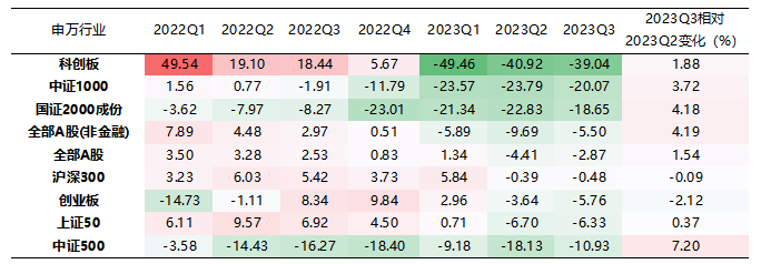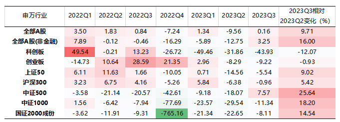 从归母净利润累计同比来看:2023年前三季度,全部A股、全部A股非金融的归母净利润累计同比增速分别为-2.87%、-5.50%,较 2023H1 归母净利润同比增速分别上升 1.54、4.19 个百分点。