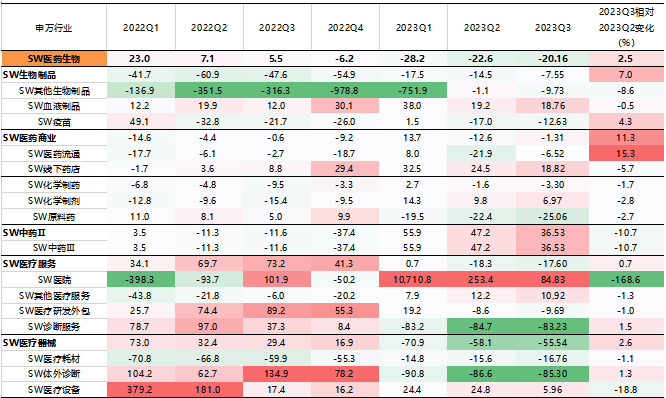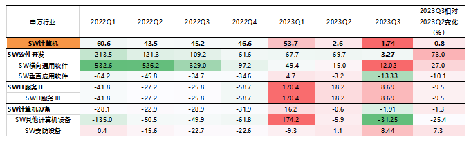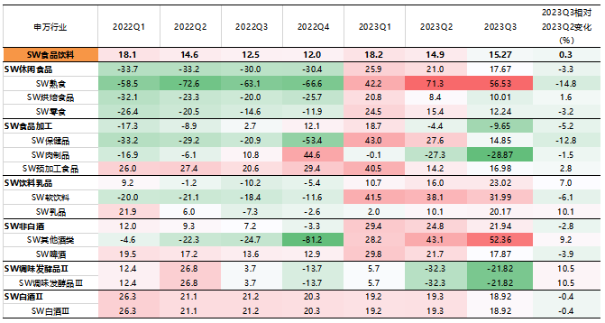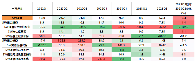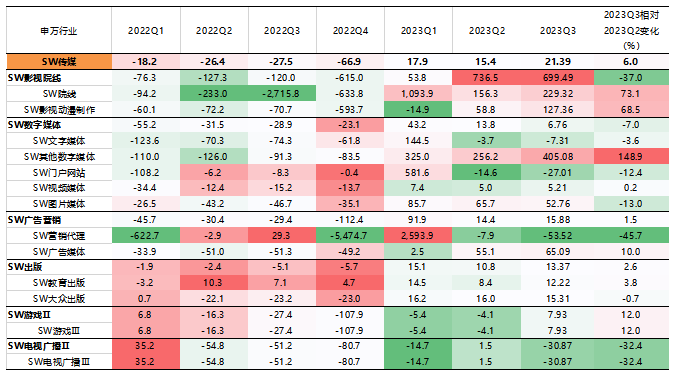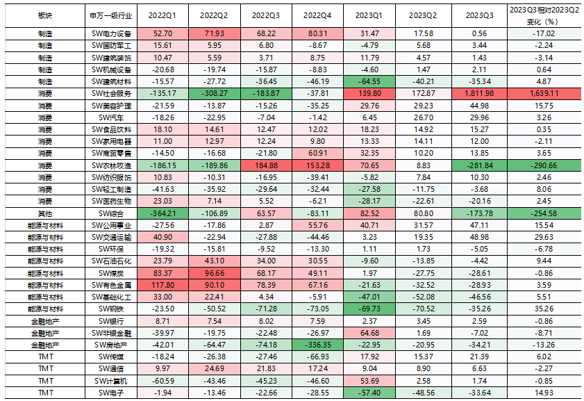 整体而言,从绝对值来看,三季报归母净利润增速较高的是社会服务、交通运输、公用事业、美容护理、汽车、传媒、食品饮料、商贸零售、家用电器、纺织服饰等行业,2023Q3归母净利润累计同比增速均超10%。而农林牧渔、基础化工、钢铁、建筑材料、房地产、有色金属、煤炭、电子、医药生物等行业,2023Q3归母净利润累计同比增速均低于-20%。
