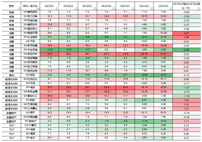 从净资产收益率 ROE(TTM)来看,2023Q3与2023H1的ROE(TTM)相比,钢铁、石油石化行业上升,而煤炭、基础化工、有色金属行业下降。