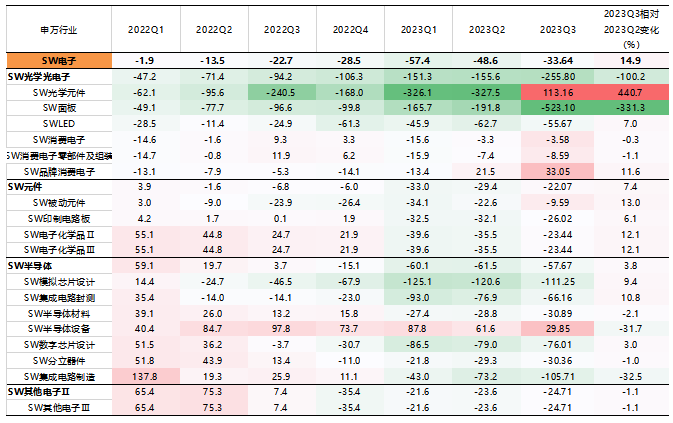 1)上游行业:受需求不足的影响,2023Q3上游行业归母净利润均为负增长,但石油石化、有色金属、钢铁、 基础化工行业的净利润降幅均较2023H1有所收窄,而煤炭行业降幅小幅扩大。