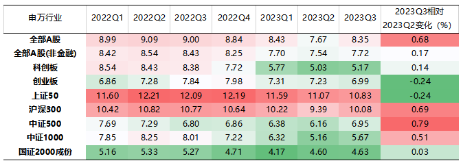 从净资产收益率来看:A股盈利能力有所改善,ROE(TTM)小幅上升。2023Q3全部A股、全部A股非金融ROE(TTM)分别为8.35%、7.72%,较2023H1分别上升0.68、0.17个百分点,为自2022Q2以来首次环比上升。