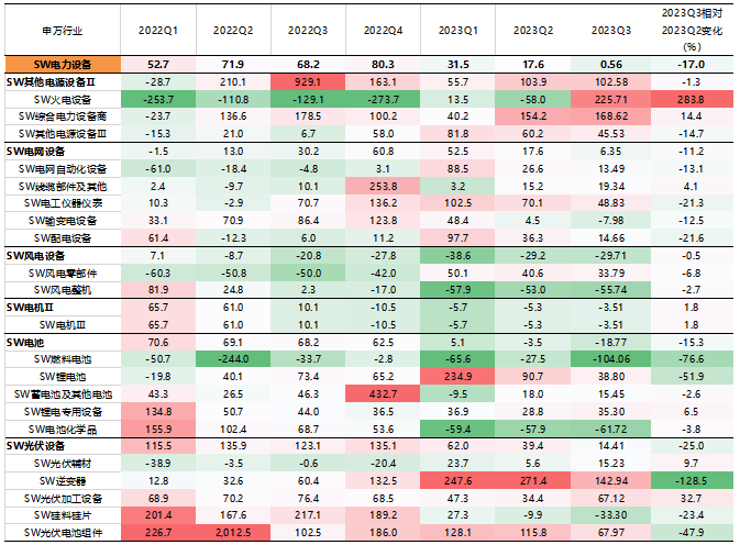 2)中游制造:从归母净利润累计同比增速来看,仅建筑材料行业录得负的增速,为-35.34%,其余行业净利润均实现增增长。从净资产收益率来看,2023Q3中游制造行业ROE与上年同期或Q3相比,全部下跌。