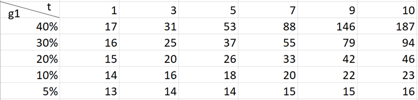 当t从10年缩减为1年时,估值从187倍下滑为17倍,可以看到相比于短期增长率,t对估值的结果影响要大得多(t=1时,不同的g2假设所得结果基本一致)。