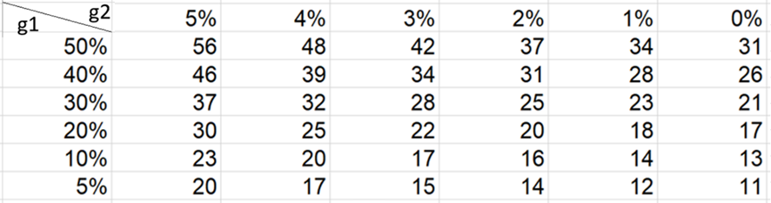 可以看到在2-3%的g2假设下,不同的g1所对应的PE大概呈1:1的线性关系,也就是我们日常喜欢使用的PEG指标,对于20%增长的公司给予20倍左右的目标PE。
