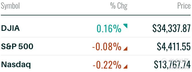 截至收盘,道指涨幅为0.16%;纳指跌幅为0.22%;标普500指数跌幅为0.08%。