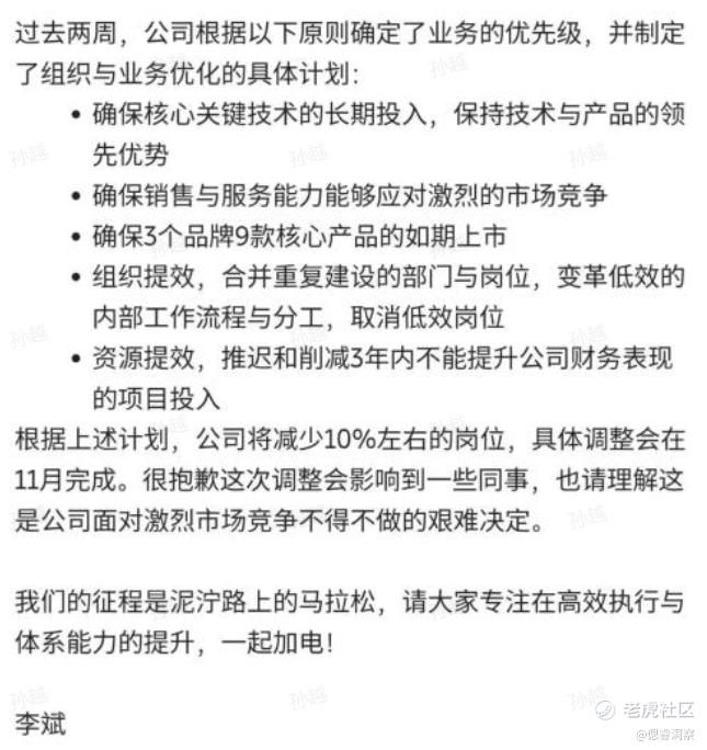 信中强调蔚来在过去两周,根据业务的优先级,制定了组织与业务优化的具体计划,并确认将减少10%左右的岗位。