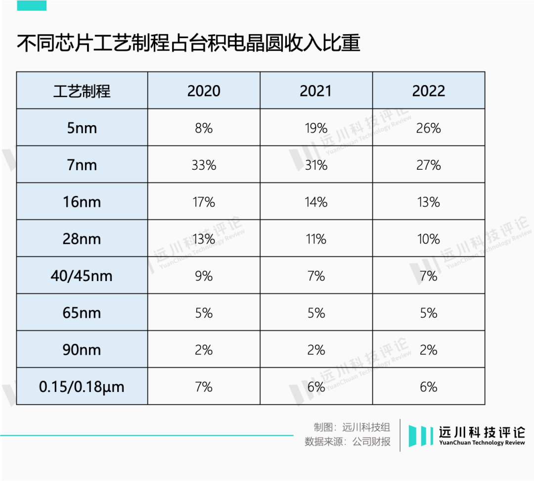 从台积电的年报中也可以发现,从2020-2022年,5nm份额逐年增加,但16nm以上的产品占比却变化不大。理论上的“末位淘汰”逻辑并未发生,真正遭到挤兑的是上一代冠军:7nm。