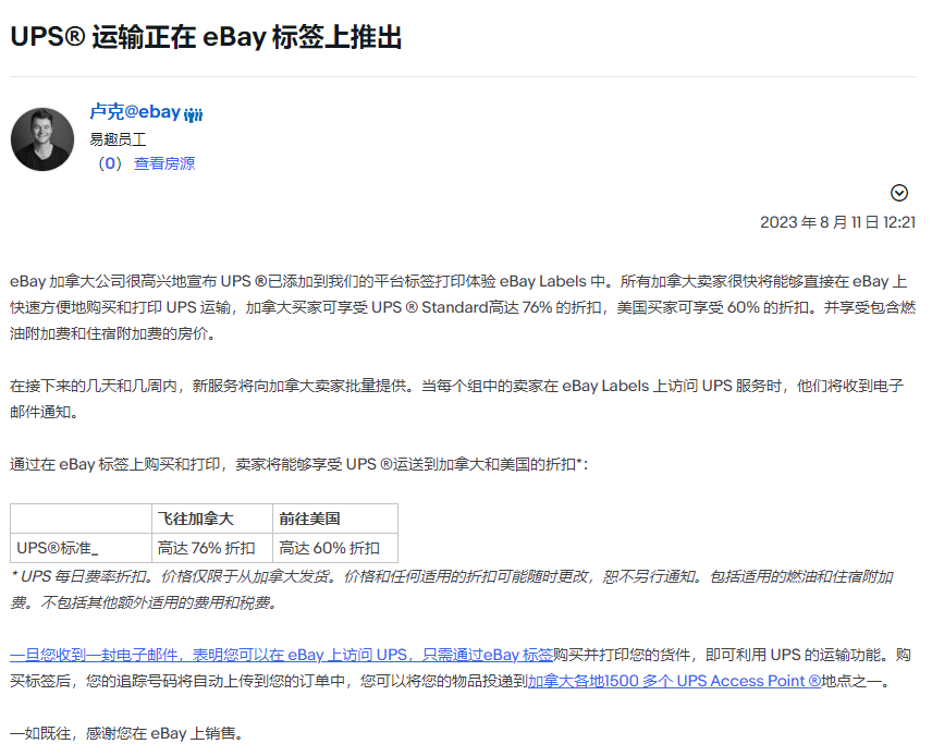 就比如,近来eBay频频发力旺季物流,将加拿大站的UPS快递服务添加到其平台的标签打印体验eBay Labels中,并且,面向那些通过eBay Labels使用UPS发货的卖家,为他们提供60%—76%不等的运费折扣,来降低卖家旺季销售的物流成本,帮助他们提高营收。