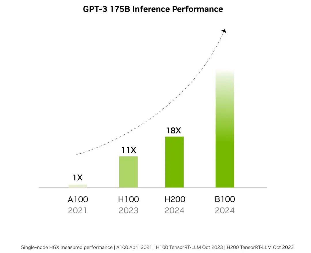 英伟达表示,从2021年推出的A100开始,AI芯片的性能每年都有显著提升,预计采用全新架构的B100 GPU将同样于2024年发布,人工智能算力相比H100、H200有望实现倍增。