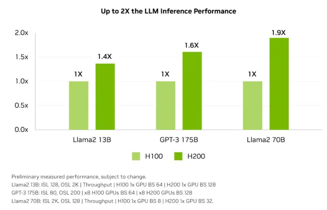 尽管GPU核心未升级,但H200凭借更大容量、更高带宽的显存,依旧可以在人工智能大模型计算方面实现显著提升,支持更多参数大模型,满足更高的工作负载,同时能效方面会有提升。