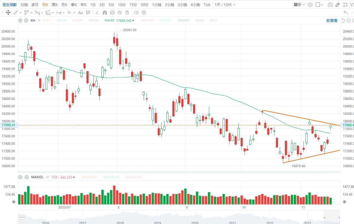 本月上旬(6日)恒指冲上18037点高位,当日早市成交664亿元,与今日相若,全日成交1151亿元,单日升302点,连升3日,累升865点或5%;恒指上周五回落至17203点收市,本周初跌至17126点掉头回升,以今日中午收市计,较上周五累升685点,挑战近一个月形成的收窄三角形顶部,半个月内第二次升穿50天线,蓄势向上突破,今日最终若可收在17950点之上便突破成功,踏入下半月向上扩阔本月仅约一千点的波幅,先挑战上月高位约18300点关。保守估计,只要本月恒指波幅与上两个月的千四、五点波幅相若,也可升上18400至18500区域。