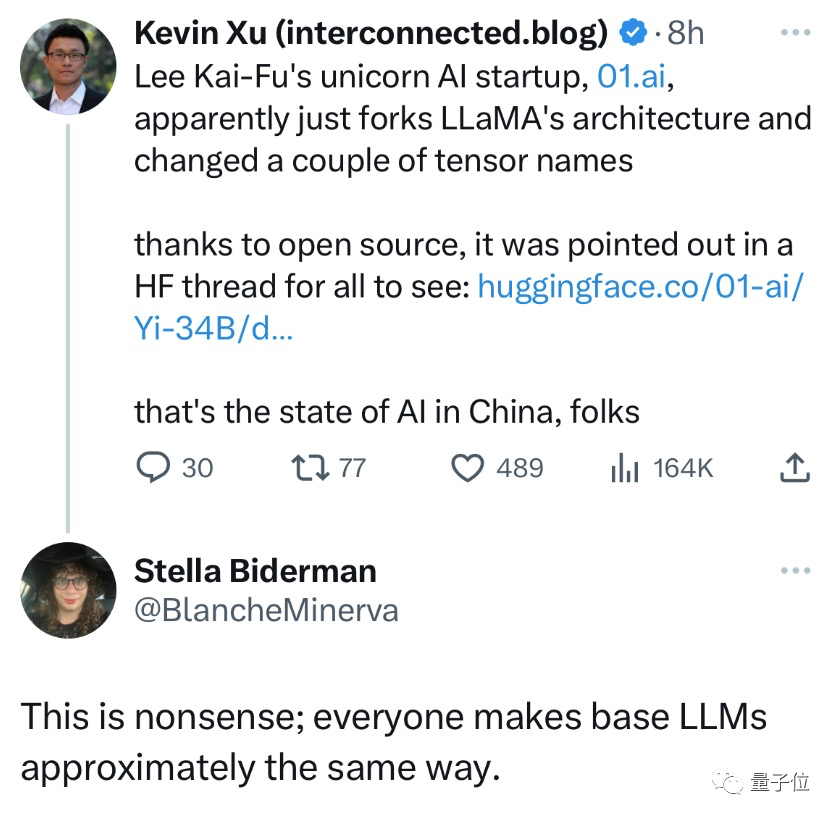 零一的回应,有人表示理解,比如开源社区领袖Stella Biderman,就认为说谁抄袭LLaMA是无稽之谈,因为所有做大模型研发的团队,现在都几乎“华山一条路”了。