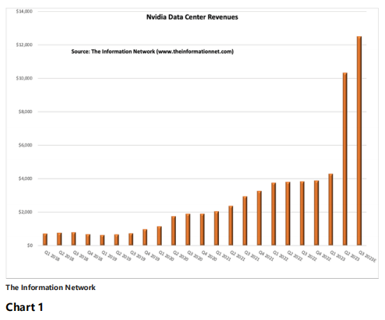下图显示了英伟达的数据中心收入增长情况,表明了市场对其芯片的需求以及对Arm的连带效应。分析师预计2024财年第三季度(2023财年第三季度)的营收将环比增长21%,该财报将于2023年11月 21日公布。