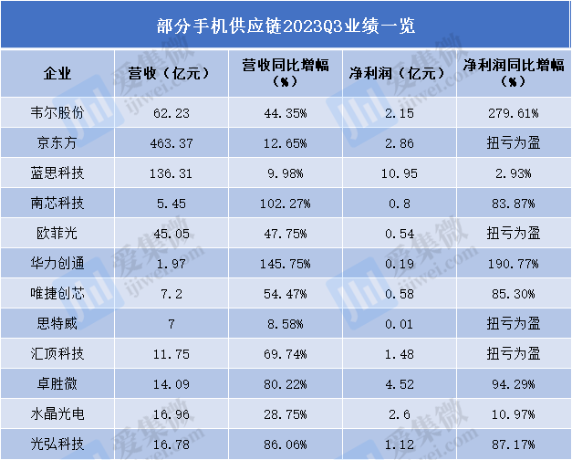 而在智能手机市场回暖以及华为抢上游产能带来的鲶鱼效应下,各品牌手机都在积极加单补库存,产业链需求迅速增加,而核心供应链厂商2023年三季度的经营业绩也实现强势反弹。