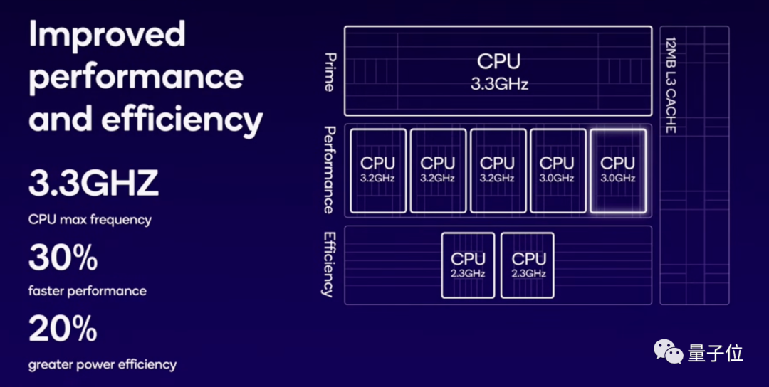除此之外,在CPU方面,第三代骁龙8采用“1+5+2”架构(1个主核心、5个性能核心和2个能效核心),相较于前代的“1+4+3”,将1个能效核心转换为性能核心。其中超大核频率提升到3.3GHz,性能核心频率提升到最高3.2GHz,能效核心频率提升到2.3GHz。