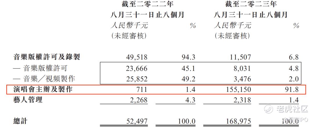 2023年6-8月,鹿晗举办巡回演唱会,因此2023年1-8月风华秋实演唱会主办及制作的收入增长至1.55亿元,占总收入的比例上升至91.8%。