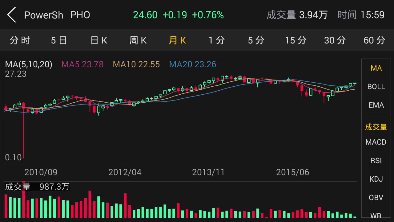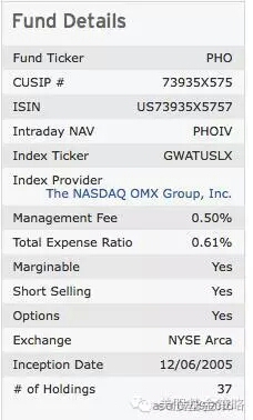 让我们先看一支代表产品,由景顺旗下的ETF厂牌PowerShares发行的PowerShares Water Resources Portfolio ETF,代码为$(PHO)$。