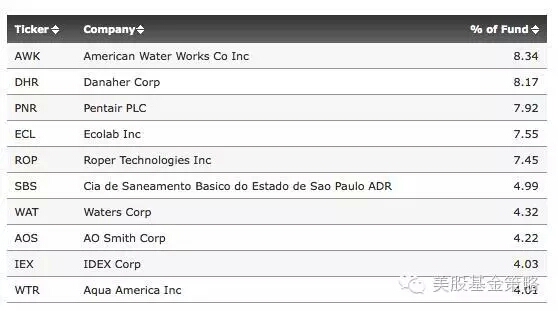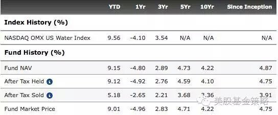 这支ETF挂钩纳斯达克水处理指数(NASDAQ OMX US Water Index),投资于与水处理相关的上市公司,包括材料、基础设施、相关设备、或者方案提供的业内公司。