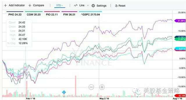 绿线的CGW收益与PHO相当,这是Guggenheim发行的一支ETF,挂钩的是标普发布的水处理产业指数。
