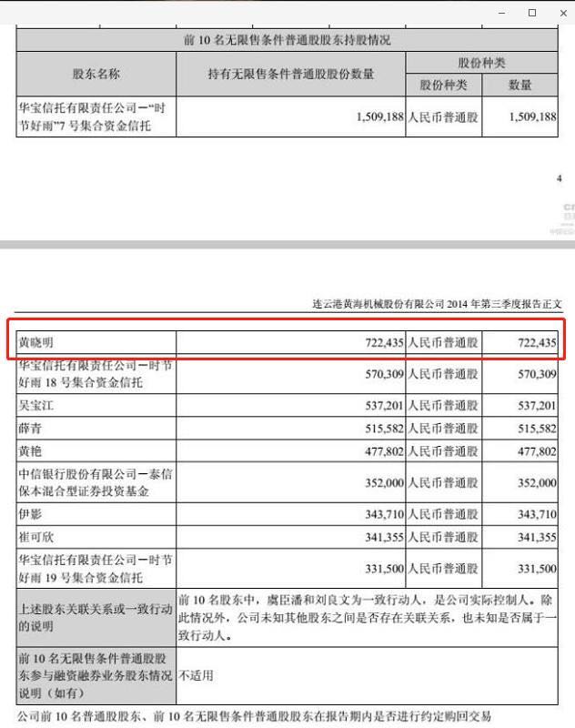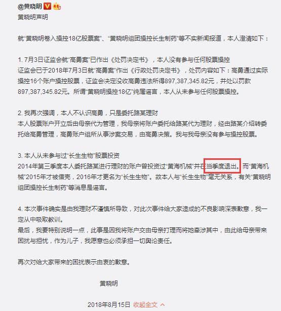 【《黄晓明声明》在说谎 】今天凌晨,处于舆论中心的黄晓明通过微博发出《黄晓明声明》,整个“声明”并没有太多的新意。无非是针对昨天媒体关于黄晓明投资长生生物的话题,增加了一点新内容,称自己与长生生物毫无关系。表示自己2014年第三季度委托路某进行理财的账户曾投资过“黄海机械”并在当季度退出。但当季度退出的说法显然是在撒谎,不然黄晓明账户如何还会出现在该公司三季度的大股东名单上呢?