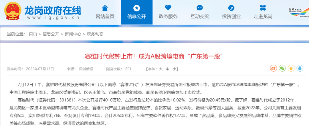 赛维时代上市 图源:龙岗政府在线