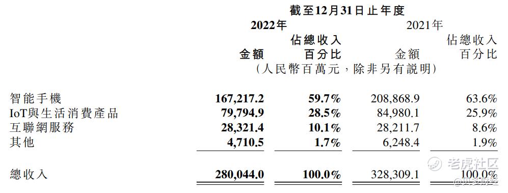 2022年度,占小米总收入比例59.7%的智能手机业务实现收入1672.17亿元,较2021年同期的2088.69亿元下降19.9%;出货量也由2021年的1.90亿部下降20.9%至2022年的1.51亿部。