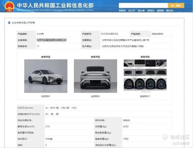 就在近日,小米汽车出现在了工信部第377批《道路机动车辆生产企业及产品公告》新产品公示清单中,申报型号为SU7和SU7 Max,由北京汽车集团越野车有限公司生产。这也意味着,小米汽车的正式面世不远了。
