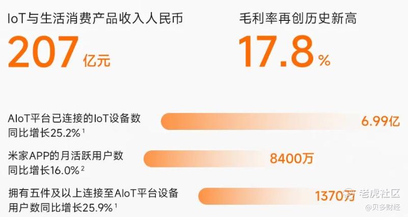 得益于小米平板和国内若干生活消费产品的强劲增长,小米IoT与生活消费产品业务于本季度实现毛利率17.8%,较2022年同期增长4.3%,环比增长0.2个百分点。