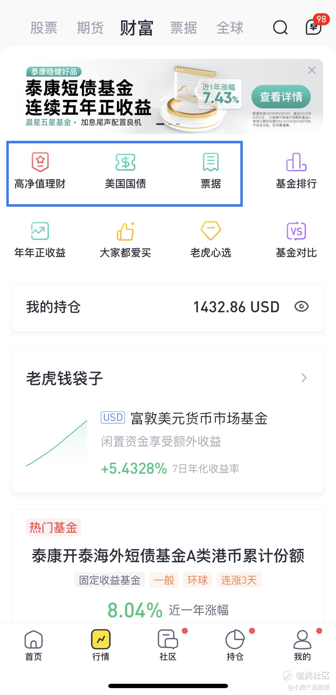 财富tab目前已支持新上线的投资品类:高净值理财、美国国债、票据(部分产品需要满足一定的交易权限才可交易)