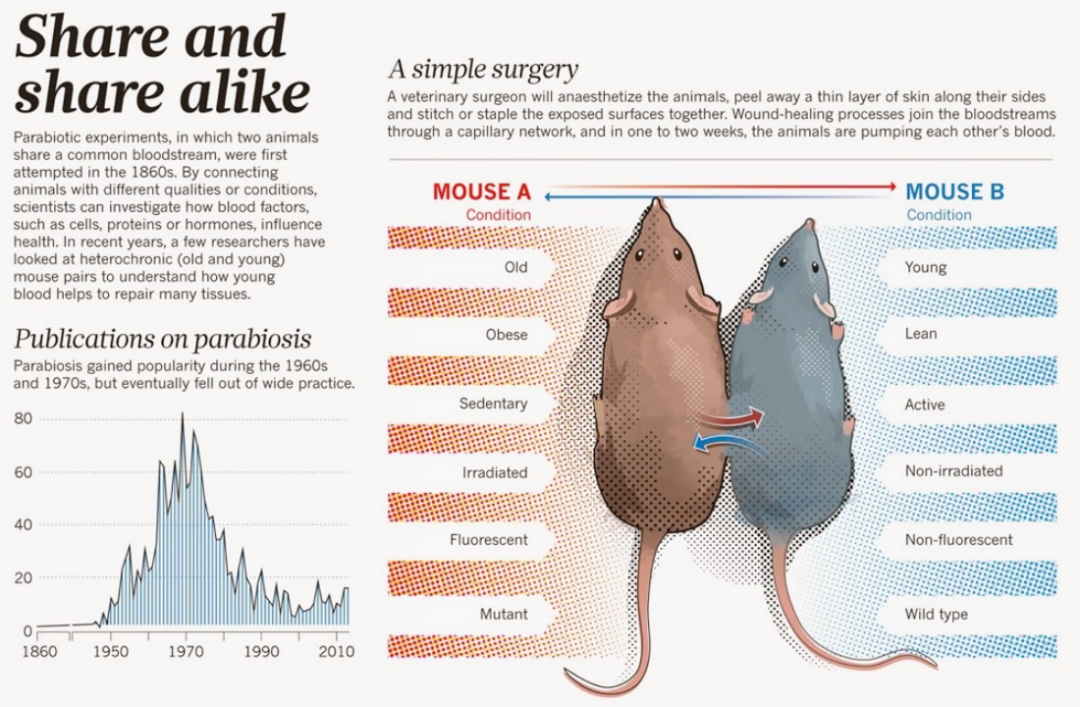 紧接着麦凯又做了另一个让人瞠目结舌的实验。称为Parabiosis共生实验。麦凯找来两只老鼠,一只老的,一只年轻的,通过手术的方法将两只老鼠臀部的血管系统连在一起,形成共享血液循环的状态。结果发现,年老的老鼠在共享了年轻老鼠的血液后,健康情况明显变好。年老的老鼠寿命增长了15%,这说明在年轻老鼠的血液里,存在着一种抗老化的因子。