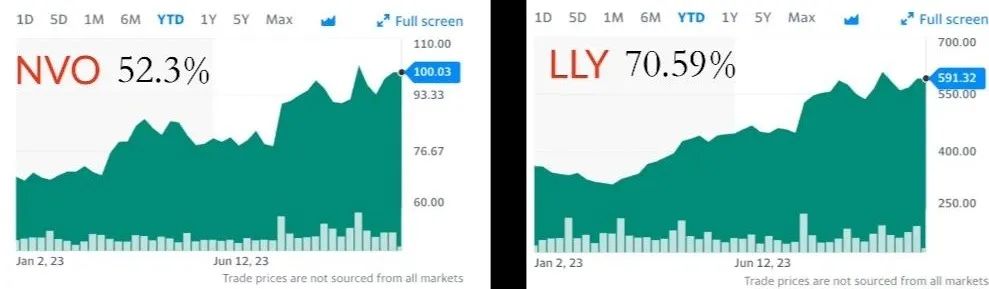 因此,保持合理的体重对于健康和长寿至关重要。近年来,随着肥胖率的上升,减肥药的市场也越来越大。美股减肥药概念股诺和诺德(NVO)和礼来(LLY)在今年美股市场中表现非常靓丽。截至上周今年NVO涨52.3%,LLY涨70.59%,