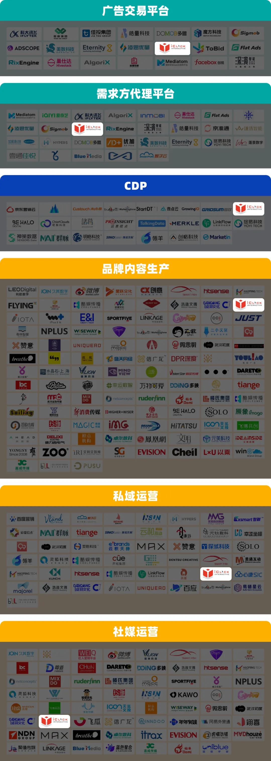 凭借覆盖营销全链路的扎实产品力与服务力,爱点击集团iClick(NASDAQ:ICLK)旗下多款产品及解决方案成功入选生态图3大领域的10个细分赛道,分别覆盖服务与管理(广告交易平台、需求方代理平台)、触点和内容(私域运营、社媒运营、品牌内容生产、小程序&H5、营销自动化、搜索引擎营销)、数据和运营工具(CDP、SCRM)。