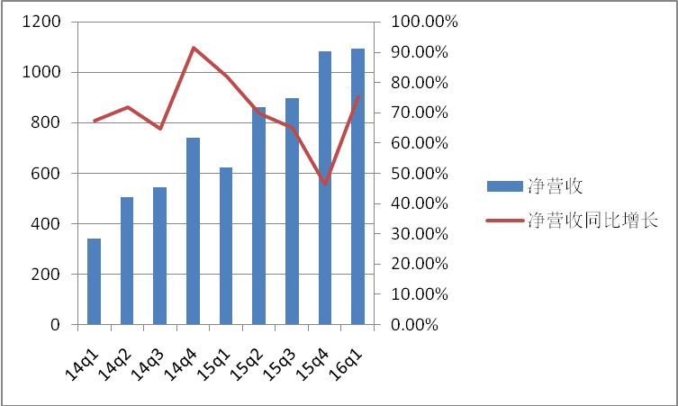 从2016年1季度财报看,净营收10.9亿元,同比去年同期增长了75.5%。