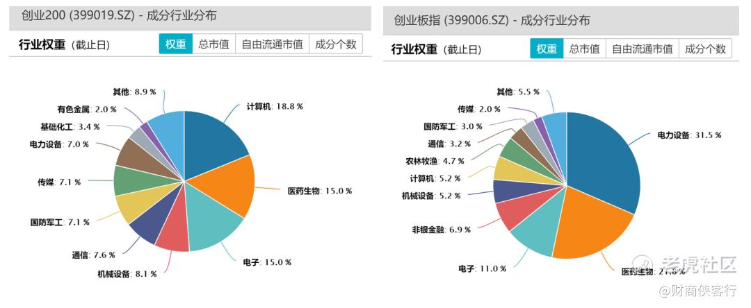 根据申万一级行业分类,创业200指前五大权重行业分别是:计算机(18.8%)、医药生物(15%)、电子(15%)、机械设备(8.1%)和通信(7.6%),合计占比64.5%。而创业板指前三大权重行业合计占比就已经达到64.3%。