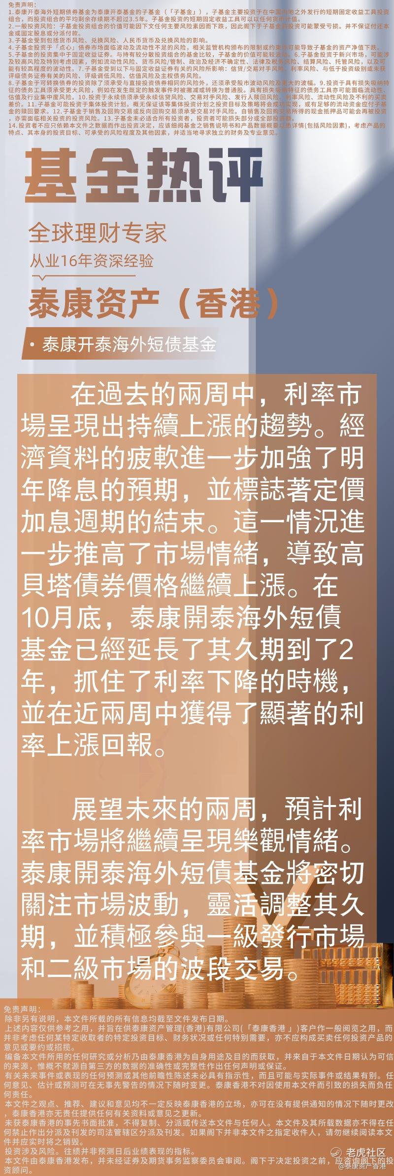 在过去的两周中,利率市场呈现出持续上涨的趋势。经济数据的疲软进一步加强了明年降息的预期,并标志着定价加息周期的结束。这一情况进一步推高了市场情绪,导致高贝塔债券价格继续上涨。在10月底,泰康开泰海外短债基金已经延长了其久期到了2年,抓住了利率下降的时机,并在近两周中获得了显著的利率上涨回报。
