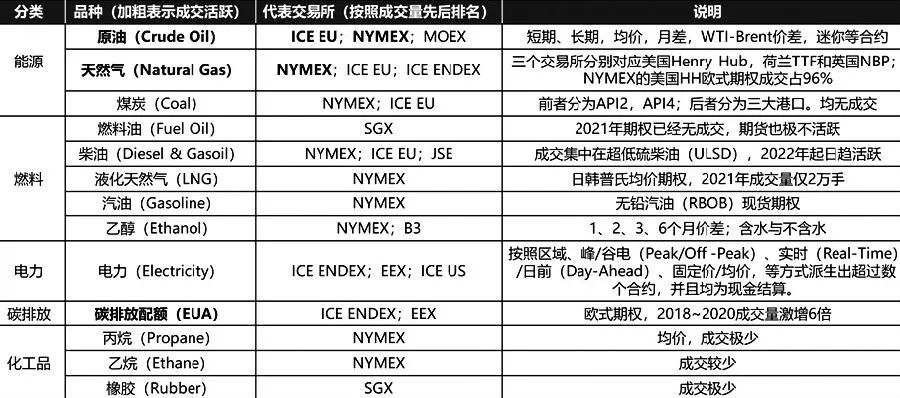 根据国际期货业协会(FIA)2021年的成交报告,境外商品期权可以划分为农产品、能源化工和金属三类,共计50种。其中历史悠久的农产品期权达26个,涵盖谷物(4个)、油籽(7个)、经济作物(5个)、乳制品(5个)、家禽(2个)以及只有印度国家商品及衍生品交易所(NCDEX)上市的鹰嘴豆、瓜尔豆胶和瓜尔豆种子。能源化工数量达到了13个,除一次能源的油、气、煤和5种燃料外,还有3个化工品以及电力和碳排放配额。金属共计11个,包括铜、铝、锌、镍、铅5个有色金属,还有铁矿石和热卷2个黑色金属,以及黄金、白银、钯金和铂金4个贵金属。