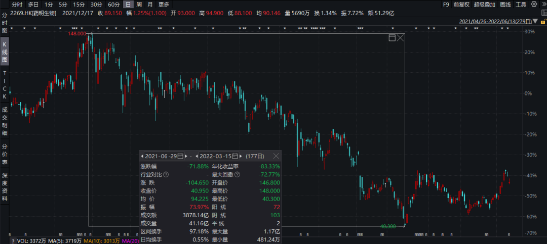 例如,第一大重仓股的药明生物,从2021年Q3到2022年Q1,最多跌去70%。这期间的迈瑞医疗也跌去40%。