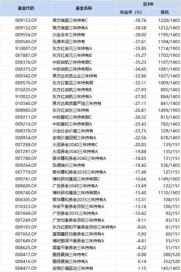 这批主打“三年持有期”的基金,几乎是全军覆没的状态,而最大亏损来到38%,有21只基金的亏损都达到20%以上。