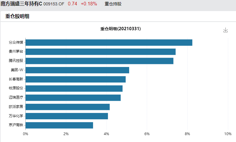 在2021年Q1时,前十大持仓为分众传媒、贵州茅台、腾讯、美团、长春高新、牧原股份、迈瑞医疗、欧派家居、万华化学、京沪高铁。