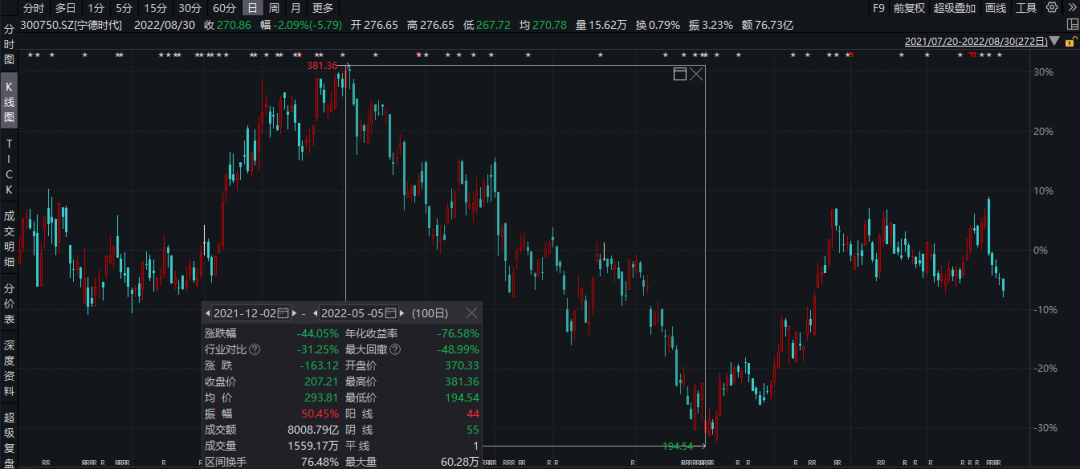结果是,这边刚割完医药的肉,亏损可能在40%左右,转头就继续追高加仓新能源。而2021年12月至2022年5月,宁德时代跌超40%。
