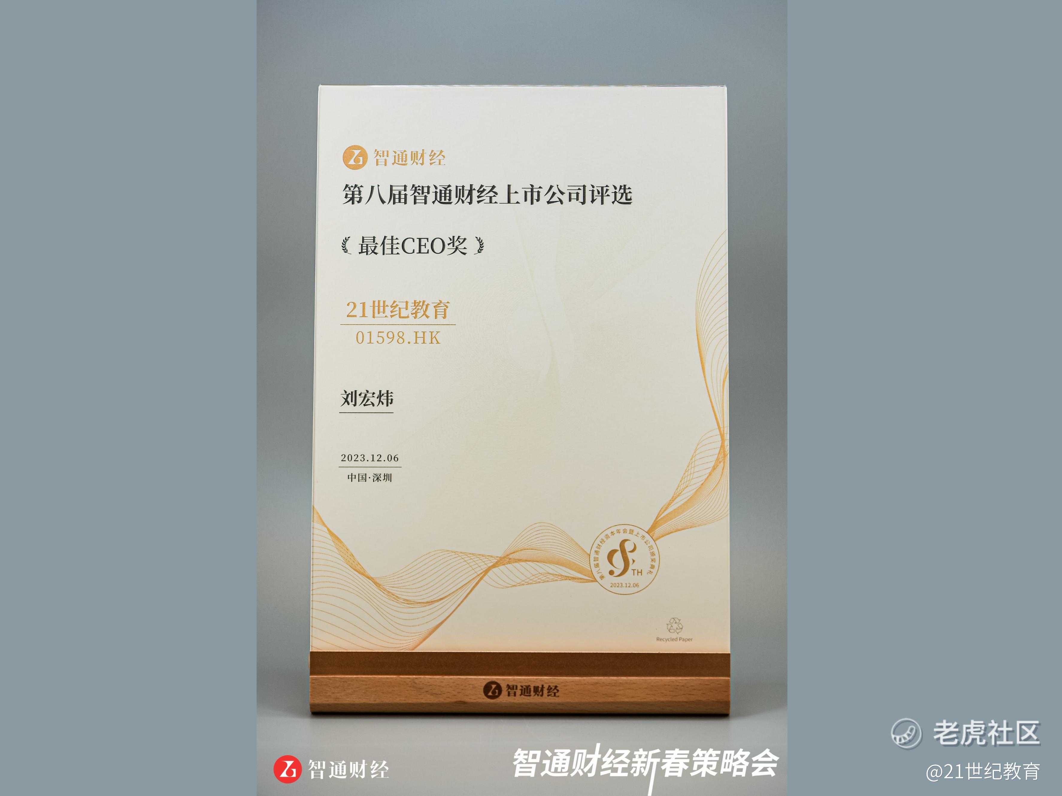 12月6日,智通财经上市公司年度评选结果在第八届智通财经资本市场年会上隆重揭晓,21世纪教育(01598.HK)执行董事兼行政总裁刘宏炜女士入选,荣获“金港股年度最佳CEO”奖项。
