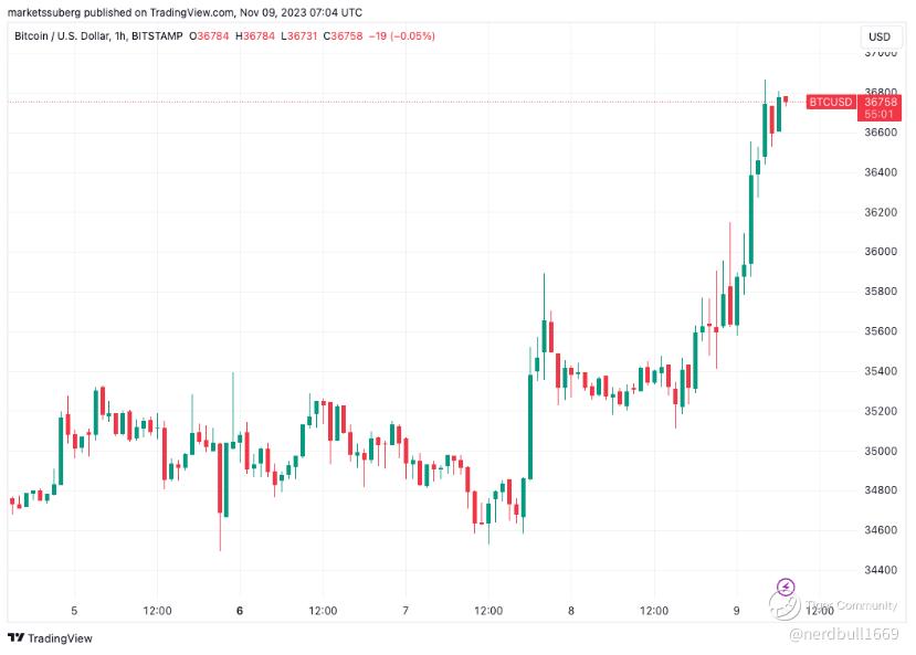 11月9日,比特币升至 37,000 美元以上,随后回落至 36,000 美元以上。随著比特币交易价格在34,000美元至 36,000 美元区域,加密货币市场的看涨情绪正在增强。